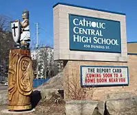 Catholic Central High School, named after the high school of the same name in Detroit, Michigan, was opened in September 1950 in what had been the Sacred Heart Convent. It consisted of grades XI, XII and XII. The Sisters of St. Joseph taught the girls and the commercial classes and the Christian Brothers taught the boys in the general classes under associate principalships held by Sr. Mary Angela and Brother Stanislaus respectively. By January 5, 1951, the Catholic Central sports teams had adopted the name Crusaders. The girls were known as Crusaderettes. It was about the autumn of 1952 that the words to the "Crusader Song" were composed by Barry McIlhargey, a grade XII student and football player. Meanwhile, the cornerstone for Sacred Heart Separate School, to the immediate west of Catholic Central High School was laid on December 8, 1951. By the time the school was officially opened on September 14, 1952, the school's name had been changed to Catholic Central Separate School (CCSS) and consisted of grades VII, VIII, IX and X. Sr. Elaine Dunn was its first principal. With the opening of CCSS, St. Angela's College, De La Salle High School and Sacred Heart Commercial closed their doors and their pupils were now absorbed into Catholic Central Separate School. The Christian Brothers also left London and Fr. Joe Finn, a diocesan priest, took Brother Stanislaus' place as associate principal. Father Dominic A. Kirwan, C.R. succeeded Fr. Finn in September 1952. In the fall of 1958 the construction of a new building for Catholic Central High School (CCHS) was begun to the west of Catholic Central Separate School. It opened for its first students in September 1959. In September 1963, CCHS was placed under the principalship of the Oblates of Mary Immaculate with Fr. Harold Conway as principal. The Board had first attempted to entice the Basilans to taken over the running of the school but the latter declined. In 1967, CCHS and Catholic Central Separate School, which for a number of years held only grade IX and X students, were joined under one principalship, with Fr. Conway as the first principle for grades IX-XIII A "tunnel" which was half above ground, was constructed to physically unite the two structures, which became known as the East Wing and the West Wing Owing to an increase in student population, a total of 14 portables were added between 1970 and 1972. The north wing which accommodates the Fine Arts & Family Studies programs was constructed in 1986.