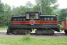 CMRR No. 29, "The Goat" is an Ex-Navy 50 ton H. K. Porter, Inc locomotive, which was a backup engine and main engine for worktrain service. It has a double-reduction gearing system in the trucks. The traction motors are mounted at 90 degrees to the axles and have bevel pinions on the armature shafts. These bevel pinions drive a larger bevel ring gear in a gear case. On one truck, the locking nut on the traction motor armature shaft came loose, and the bevel pinion jammed in the ring gear, locking up the truck. The bevel pinion jammed against the ring gear and bent it. #29 is currently for sale and remains in storage in Phoenicia.
