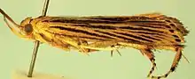 The wingspan is 17–18 mm. The forewings are light orange, clothed with dark-brown scales between veins. The hindwings are evenly clothed with dark-brown scales and light orange along veins.[1]