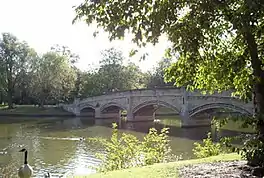 In 1876 Leicester town council bought 57 acres (23 ha) of marshy ground between the river and canal from the Earl of Dysart in order to develop flood prevention plans.[3] Planning for this first incarnation of the park was underway by 1879, as part of designs by the borough surveyors for the relief of flooding in the area.[4] However the design for the park itself was opened up to a competition. The winning design, with its bandstand, rustic bridges and planted gardens, was the work of William Barron, a celebrated landscape designer.[3] It was Leicester's first public park of significant size, and was opened on 29 May 1882 by the Prince and Princess of Wales, an event commemorated by an ornate plaque at the Abbey Park Road entrance.[5] The park was created in an area that had previously been described as "marshy ground in a poor district" at a cost of over £40,000.[6][7] The works included the widening and deepening of the river over a length of around a mile, with the excavated earth used to create mounds within the park, as well as the construction of stone weirs and locks.[8] Three new bridges were constructed crossing the river.[8] An artificial lake was created and over 33,000 trees planted.[8] Excavations as part of the work discovered remains of animals including elephants and rhinoceros.[8] The resulting park occupied 57 acres of land between the River Soar and the Grand Union Canal.[5] Two lodges designed by architect Mr. J. Tait were built at the Abbey Road entrance to the park.[9] [10]