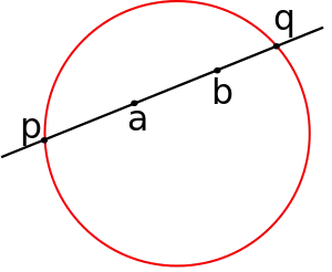 Suppose that Q is a fixed quadric in projective space that becomes the absolute of that geometry. If a and b are 2 points then the line through a and b intersects the quadric Q in two further points p and q. The Cayley–Klein distance d(a,b) from a to b is proportional to the logarithm of the cross-ratio:[12]