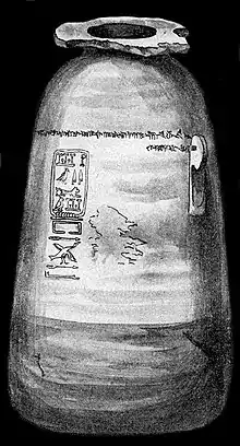 The Caylus vase is a jar in alabaster dedicated in the name of the Achaemenid king Xerxes I in Egyptian hieroglyph and Old Persian cuneiform. It was the key element in confirming the decipherment of Old Persian cuneiform by Grotefend, through the reading of the hieroglyphic part by Champollion in 1823. It also confirmed the antiquity of phonetical hieroglyphs before the time of Alexander the Great, thus corroborating the phonetical decipherment of the names of ancient Egyptian pharaohs. The vase was named after Anne Claude de Tubières, count of Caylus, an early French collector, who had acquired the vase in the 18th century, between 1752 and 1765.[1] It is now located in the Cabinet des Médailles, Paris (inv. 65.4695).[1]