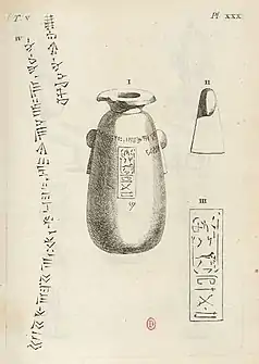 The vase remained undeciphered for a long time after its acquisition by Caylus, but Caylus had already announced in 1762, in his publication of the vase, that the inscription combined the Egyptian script with the cuneiform script found in the monuments of Persepolis.[4] Upon Caylus's death in 1765, the vase was given to the Cabinet des Médailles collection in Paris.[5][1]