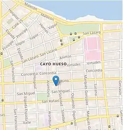 The earliest settlement in the current area of Cayo Hueso dates back to the second half of the 16th century, following the burning of Havana by French pirate Jacques de Sores. It wasn't until 1912 that the area was officially recognized as the neighbourhood of Cayo Hueso. Its name, which means "bone cay", derives from the fact that the Espada Cemetery was located there;[1] it was demolished in 1908. Among the oldest institutions in the area were the leprosy hospital (demolished in 1916), the Casa de Beneficencia orphanage (replaced by the Hermanos Ameijeiras hospital),[2] and the San Dionisio mental asylum which operated between 1828 and 1860.[3][4] The asylum was located between the cemetery and the San Lázaro hospital, and named after the then governor of Cuba, Francisco Dionisio Vives.[5]