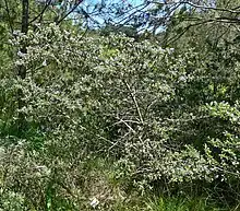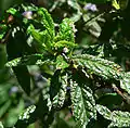 The evergreen leaves are alternately arranged, often in crowded clusters, each oblong to long-rectangular in shape and covered in glandular bumps. The edges are generally turned under and lined with glandular hairs. The inflorescence is a cluster of bright blue flowers. The fruit is a bumpy capsule about 3 millimeters long.