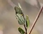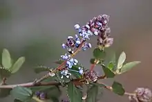 Diagnostic features include the leaves being 3-ribbed from the base, the leaf veins being more or less obscured by the hairs, and the teeth on the edge of the leaf being tipped with glands, which sets it apart from plants like Ceanothus cyaneus. The twigs on this species are also flexible and not thorn-like, as opposed to species like Ceanothus leucodermis with rigid, thorn-like twigs.[2][3][4]