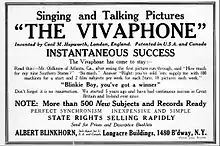 By 1910, Hepworth was also the inventor of Vivaphone, an early sound on disk system for adding sound to motion pictures. The device used phonograph records to record and play back the sound. Hepworth's vivaphone was distributed in Britain and also in the United States and Canada.[4][5]