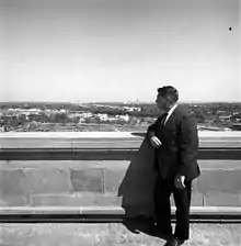 Stoughton took the only photograph ever published showing John F. Kennedy, Bobby Kennedy and Marilyn Monroe together.[5] Stoughton was present at the motorcade at which Kennedy was assassinated, and was subsequently the only photographer on board Air Force One when Lyndon B. Johnson was sworn in as the next President.[6] Stoughton knew it was "tasteless," but suggested a photograph needed to be made of the "history-making moment ... and I think we should have it."[7] Kenneth T. Walsh even agreed and said of Stoughton's picture that Air Force One "has become associated with incredibly powerful images" and "a symbol of the country and a reminder of history."[8] His photograph, the most famous ever taken aboard a presidential aircraft,[9][2] depicts Johnson raising his hand in oath as he stood between his wife Lady Bird Johnson and a still blood-spattered Jacqueline Kennedy.[10] Stoughton recounted this event and his service as White House photographer during Johnson's first two years in office in an oral history contributed to the Lyndon Baines Johnson Library and Museum.[11][12]