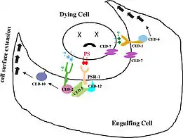 9. Wang X, Wu YC, Fadok VA, Lee MC, Gengyo-Ando K, Cheng LC, et al. (November 2003). "Cell corpse engulfment mediated by C. elegans phosphatidylserine receptor through CED-5 and CED-12". Science. 302 (5650): 1563–6. Bibcode:2003Sci...302.1563W. doi:10.1126/science.1087641. PMID 14645848. S2CID 25672278.