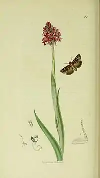 Larva pinkish ochreous to purplish brown; dorsal and subdorsal lines pale; the tubercles black; head, and thoracic plate pale reddish brown. The larvae feed on the root crowns and stems of various grasses, as well as Eriophorum and Juncus species. Adults are active during the night and day and feed on flower nectar of Calluna vulgaris, Origanum vulgare and Molinia species.[2]