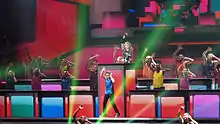 The Benny Benassi remix of "Celebration", interpolated with lyrical and musical elements of "Give It 2 Me" (2008), was performed as the final number of The MDNA Tour (2012). After Madonna finished performing "Like a Prayer" (1989), the lights went out and the bell sounds used on the beginning of "Girl Gone Wild", which opened every concert, played for a few minutes.[48] As the song began, 3D colored cubes formed on the backdrop screens while the stage was bathed in different colored lights and lasers.[49] Madonna came out, dressed in a Joan of Arc-inspired look with black tight pants, metallic shirt and Swarovski crystals, and sang the song while her dancers did choreographed moves all over the stage.[50] Towards the end of the performance, they put on Beats by Dr. Dre and mimicked DJ style movements.[51][52] On certain shows, Madonna's son Rocco Ritchie joined her onstage.[53]