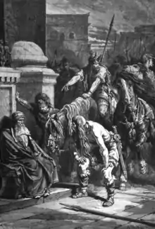 The earliest encounter with the Romans in 387 BC resulted in all of Rome apart from the Capitoline Hill falling to a confederacy of Gaulish tribes led by Brennus of the Senones. Little or no detail is given of the methods of warfare of these Gauls except that according to Plutarch some were armed with swords and some were mounted.[14] In 280 BC another Brennus led a formidable Celtic army South to attack Greece and Thrace. According to Pausanias this force included large numbers of cavalry, organised in a system called Trimarcisia (from the words *tri- *marko- "three horse") dividing them into teams of three, only two of whom would be mounted at one time. Brennus' expedition would have originated in Pannonia and Noricum, a region which later became famous for producing high quality steel for weaponry. Celts were renowned for their ability to make swords of bronze and iron. Swords were too expensive for many common soldiers so they fought with spears or slings instead.[15]