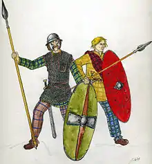 Roman conquest eventually extinguished the independence of all the Celtic peoples except in Ireland, Scotland, Wales and Cumbria. After the Roman era, only in the British Isles, therefore, could there be said to still exist a distinctly Celtic style of warfare. Ireland was the last region to adopt the La Tène mode of Celtic technology and with a smaller and less dense population than that of the British or Continental Celts, may have sustained the era of small scale élite combat for longer. Traditional patterns of warfare seem to have continued all the way to the Viking and Norman invasions, conducted by foot soldiers, lacking metal armour including helmets, fighting with spears and javelins, occasionally axes and in the case of higher status warriors, swords, protected by a round or oval shield.[8] The Viking invasions saw the adoption of the bow in addition, but never in great numbers.[8] The Norman invasion in the 12th century and the ineffectiveness of traditional tactics in resisting it led to the Irish moving towards a more typically medieval style of warfare exemplified by the Gallowglass infantry soldier.