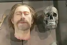 The Celtic influence over the Germanic culture is a long debatted topic, it is generally accepted that Celtic languages had an impact on Germanic languages,[26] however their impact on myths[27] and material culture[28] is more difficult to assess. The Germanic languages borrowed much of their vocabulary related to politics, leadership, iron smithing and medicine from the Celtic languages, such as *rik- ‘king’, *isarna ‘iron’,*ambahtaz ‘servant’, *brunjon- ‘mailshirt’, *lekijaz ‘physician’,*gislaz ‘hostage’, *Rinaz ‘Rhine’, and *walhaz ‘foreigner’.[26] In Denmark, the Wagons from Dejbjerg and the bronze kettle of Sophienborg Mose show huge similarities with the La Tène artistic culture, notably the bull figures on the kettle[29] and the figure of a man on a wagon. About the weaponry, double-edged La Tène swords found at Værebro and Tissø (Zealand, Denmark), Vogn (Hjørring, Denmark) and Lindholmgård (Scania, Sweden) suggest a likely cultural transfer through local elite.[30][31] The famous Hjortspring Bog where a boat and multiple weapons have been found is displaying Celtic influence, specifically in the spearheads and the chainmails.[32] In the regions associated to Elbe Germanic groups, double-edged La Tène swords similar to those from Denmark have been found at Großromstedt (Thuringia, Germany)[33] There is a correspondence in the weaponry found in graves at Schkopau and Großromstedt with the description of the Gallic society by Poseidonios where there is a hierarchy for the warrior's companions, from the shield-bearers to the spear-bearers and finally the chief at the top.[34] The presence of La Tène items in Thuringia could be also due to a growing influence of Przeworsk culture from the East at the end of the 1st century BC.[35]