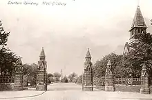 Although "Cemetry Gates" was inspired by Southern Cemetery in Manchester, the song's central lyric, "Keats and Yeats are on your side/While Wilde is on mine", makes reference to the graves of three noted literary figures who are buried elsewhere; John Keats lies buried at the Protestant Cemetery, Rome,[8] W. B. Yeats remains are in the churchyard of St Columba's Church, Drumcliff in Ireland,[9] and Oscar Wilde's tomb is in Père Lachaise Cemetery in Paris.[10] In 2006, Morrissey posed for a photo shoot with Mojo Magazine leaning on Keats' gravestone.[11][12]