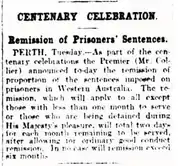 In October, the Premier, Philip Collier announced that prisoner sentences of more than one month would be reduced at the rate of two days for each month of sentence remaining, after allowing for good conduct. Prisoners serving sentences during His Majesty's pleasure were excluded from the remissions.