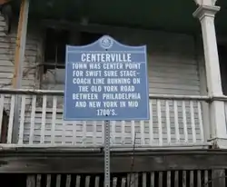 Centerville was a hamlet within Readington Township in Hunterdon County, New Jersey, United States.[2] The community was located along Campbell's Brook (now Pleasant Run) and Old York Road. Centerville grew up because of a tavern that marked the halfway point on the long Swift Sure Stage Line route from New York to Philadelphia. The hamlet had a school, a store, a post office, a church and blacksmith.[3] When the railroads and newer roads were built, Centerville saw few visitors and today all the buildings there are residences.