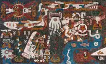 This wall corresponds to the pre-Hispanic era and puts into play the life-death duality. This wall is dominated by mythical elements. On the left side of the main axis, separated into three different planes, we can see deities and scenes pertaining to the life-creating principle: on the upper corner is the Sun, framed by Quetzalcoatl in the guise of a serpent; below this, the figure of Tlaloc emerges carrying a mat on his back; the section is complemented by Huitzilopochtli holding a shield and the Xiucoatl, the precious serpent. In the central section, we see Tlazolteotl, the earth goddess, surrounded by the eagle, a solar attribute, and by the jaguar, the symbol of the night. Inside a temple in this there is Teccistecatl, a masculine deity associated to the Moon and to fertility. On the lower part of this wall is a ritual ceremony of a propitiatory nature, in which the sacred meaning of the war is emphasized. The right-hand side of the mural represents the antithesis of life: the world of mystery, that of the dark side of things, of evil and death. Here we can perceive Quetzalcoatl's serpent drawn by using chalchihuits (jade-like stones) and shells; below the serpent que can contemplate the image of Chalchiutlicue, the water goddess, and in front of her is a bonfire where her son is being sacrificed in order to give birth to the Moon; besides this scene, we find Tezcatlipoca, the creative principle and lord of the sorcerers, accompanied by a skull. The center of this part of the wall is dominated by the dual representation of Mictlantecuhtli-Quetzalcoatl, in the lower area we find images of warriors along with prisoners of war that complement the chapter related to human sacrifice.