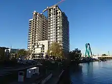 In 2020, a large real estate was unveiled on the western tip of the park, "River Tower".[6] Located along the river, in the vicinity of Łuczniczka and Torbyd halls, it consists of a pair of 64 metres (210 ft)-high and 20-floors towers. The twin buildings, encompassing 128 apartments, are the tallest residential edifice in Bydgoszcz and houses also a restaurant, a gym, a playing ground for children and a mini-marina.[7]