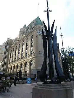 The Central Post Office is a historic building in Ottawa, Ontario, Canada. The building was completed in 1939, replacing a Second Empire style office built in 1876. This original office was located in what is today Confederation Square, and was demolished in order to construct the grand public space. The new office was designed by W.E. Noffke, it is located on the western edge of the square at the end of Sparks Street. The new site required the demolition of the Royal Bank of Canada building (built originally for James Hope and Company). The office combines the distinctly Canadian Chateauesque style with Art Deco elements. It is noted for the decorative carved lions arranged around its base.