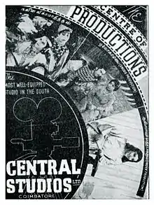 Central Studios was an Indian film studio in the neighbourhood of Singanallur, Coimbatore in Tamil Nadu, started by B.Rangaswamy Naidu (a.k.a. B. R. Naidu) and other prominent industrialists like Swamikannu Vincent of Coimbatore in 1935 to make Tamil and other South Indian language movies. The studio was a major hub of Tamil movie production and notable for its association with many early day Tamil Movie Superstars, directors and script writers etc. and many making their career debuts here. The studio is best remembered for movies like Sivakavi, Velaikari and Haridas.