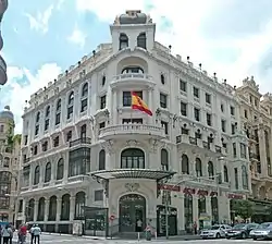 After changing headquarters on several occasions, the company bought a plot of land on the new Gran Vía, bordering Calle del Clavel and Calle del Caballero de Gracia.[3] It was soon obvious the surface area to be insufficient, so a smaller adjoining one was added, making a total of 965 square meters.[2]