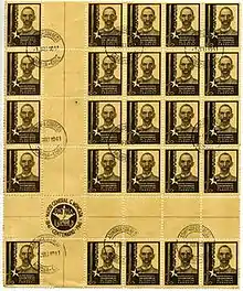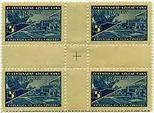 Centro de hoja or Center of the sheet is a kind of Cuban postage stamps where there are intersecting gutters between four panes of stamps.[1] The horizontal and vertical blank gutters divide the sheet into quadrants of 25 stamps each. The center four or sixteen stamps on a sheet of 100 stamps are collected similar to how plate blocks of four stamps are collected in the United States. The first centro de hoja were the imperforate Cuban patriots issues of 1926. These had the unique distinctions of being from sheets of 400 rather than 100 and the "gutters" consisted of nothing more than two intersecting lines drawn through the center of the sheet.[2] The last was produced with the three bicentennial of coffee issues of 1952.[3] Some people classify the Christmas issues of 1960[2] as centros de hoja, but since they have no gutters others call them special format stamps.