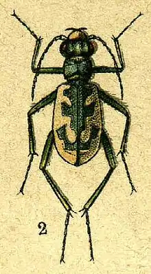 Cephalota elegans is a ground beetle species in the genus Cephalota. European-Siberian steppe species. Body length 12-15 mm. Top copper or bronze-green with a white pattern on elytra. Legs and underparts with a metallic sheen. Head with powerful long jagged mandibles. Beetles and larvae are typical diurnal predators. Beetles fly well and run fast. Larvae live in vertical mink.
