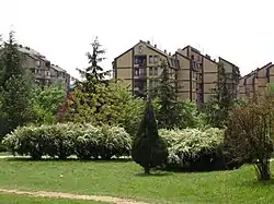 All streets are named after trees. Some after the species planted along them as avenues, some after generic ones: ash, linden, cedar, red oak, plane, birch, Pančić spruce, etc.[5] The building type is apartment block, usually paired in a line of G+3 and G+6 floors high. There’s only light traffic (access roads) inside the neighborhood. The nearby area is residential with developing commercial sector since the 1990s. A shopping mall with a McDonald's restaurant is in the immediate vicinity, with a farmers' market and a number of other stores nearby.