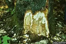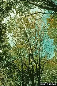 This fungus is often found as a saprophyte on logs of woody species.[1] It causes sapstreak disease in just one host species: Acer saccharum, commonly known as the sugar maple or rock maple. Symptoms include a sparse crown, dieback, dwarfed leaves, and cankers. Infected trees may die suddenly or languish for 2–4 years. The symptom most characteristic of sapstreak disease is yellowish-green stained wood that is also very moist.[2][3] Once the wood is cut and dries, the stains turn light brown, so they're difficult to see and diagnose at that point.[1]