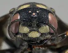 Cerceris fumipennis is distinguished by five conspicuous characteristics:
