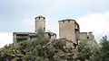 The square keep, 11 metres (36 ft) high, dates from the 12th century. An older rectangular dwelling is attached to it. It has two levels, and in the 14th century were added merlons, battlements and a bretèche above its door. Four outbuildings, a round tower and a castral chapel complete it. A first small enceinte isolates the buildings of the castle from those of the medieval village located below on the north side. This village is itself surrounded by a second enceinte which encloses everything. The main access is through the northeast gate