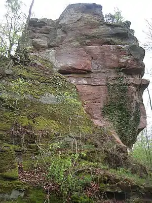 The castle is located 100 m from another castle, the Château du Falkenstein. The castle was mentioned in the 14th century as the property of the Dukes of Lorraine. It passed as a fief to the Wasselonne family and was destroyed around 1435.[1] In 1437, the Bishop of Strasbourg settled a difference between Guillaume de Falkenstein and Frédéric de Thann concerning the demolished fortress, zerbrochene Feste, of Helfenstein.[2]
