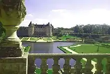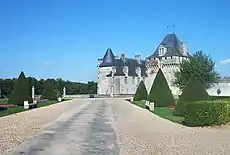 The château has a jardin à la française, redone in 1936-1939, featuring a terrace with an Italian gallery, a monumental stairway, a parterre with four compartments and a fountain, topiary, and statues. The property is entered via the Porte des Lions, an imposing 17th century edifice. Inside the moat is the keep, an ancient machicolated tower.