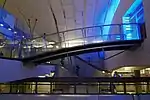 The station has two parts connected to each other by a long corridor equipped with two moving walkways.