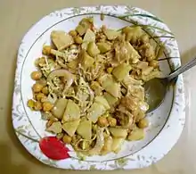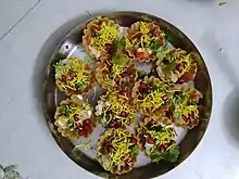 Chaat or chāt (lit. 'lick, tasting, delicacy') is a family of savoury snacks that originated in India, typically served as an hors d'oeuvre or at roadside tracks from stalls or food carts across South Asia in India, Pakistan, Nepal and Bangladesh.[1][2] With its origins in Uttar Pradesh, India,[3] chaat has become immensely popular in the rest of South Asia and the Caribbean.