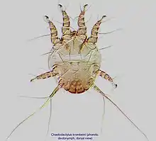Chaetodactylus krombeini, (Krombein's hairy-footed pollen mite), was described by Karl Krombein and E. W. Baker in the 1960s. The mites are about 0.5 mm across, with the females larger than the males. Pollen mites are a kleptoparasitic pest of Megachilid solitary bees, with Ch. krombeini found with Osmia lignaria of North America, (the Blue Orchard Mason Bee). Pollen mites do not feed on bees, but rather their provisions, and are harmful because they consume the food resources and starve or stunt the developing larvae; there is evidence that pollen mites also directly harm the egg by puncturing it.[1][2][3]