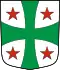 The blazon of the municipal coat of arms is Argent, between a Cross pattee Vert overall four Mullets of Five Gules.[5]