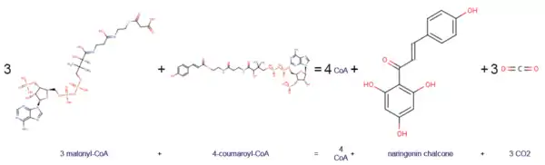 4-coumaroyl-CoA and three units of malonyl-CoA are converted into three molecules of carbon dioxide, four molecules of coenzyme A and one unit of naringenin chalcone.