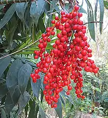 When growing outdoors it prefers moist soil and indirect sunlight, and typically reaches 8–10 ft (2.4–3.0 m). It does well in homes and commercial buildings, usually only reaching 4–6 ft (1.2–1.8 m) when grown in containers.[3] With its low maintenance requirements and showy red fruit, it has gained the Royal Horticultural Society's Award of Garden Merit.[4]