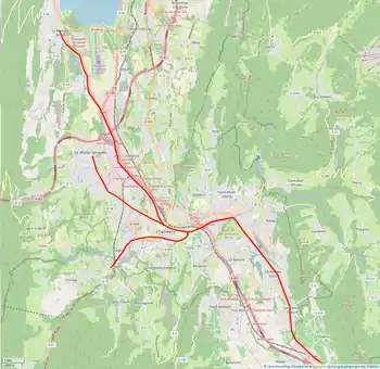 The Chambéry tramway was a network of four lines arranged in a star around the Chambéry railway station in Savoy. It was built at the suggestion of the entrepreneur Philippe Cartier-Million from La Motte-Servolex. Inspired by the Decauville railway at Exposition Universelle (1889), he chose a gauge of 600 mm, which was unusually narrow at the time.[4] In October 1890, he obtained the concession for the line between Chambéry and La Motte-Servolex and founded the Société anonyme des Tramways de Savoie. The first tram was put into service on this line in August 1892. Three other lines were opened until 1910: 1897 to Challes-les-Eaux, 1906 to Cognin and 1910 to Le Bourget-du-Lac. In the same year the company filed for bankruptcy. The network was taken over by the Savoie General Council, which reorganized the network and operated it first through an escrow account and then through the Régie Départementale. A decree of 8 February 1913 authorised the Régie Départementale des tramways de la Savoie to take over the operation of the network under "direct management".[4] In 1929, the section between Challes-les-Eaux and Saint-Jeoire-Prieuré was closed down, whereupon the tramway ended up again at its former terminus in front of the Casino, where it had been before the line was extended in 1905.