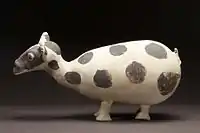 Other common ceramic vessels were oblong jars with narrow necks and wide mouths, with designs in the form of human faces and geometric shapes painted in the black on cream technique. Other common animal shapes are birds or llamas.[3] Another common class of items were cuchimilcos, small standing human-shaped idols with prominent jaws, wide black painted eyes, and prominent modeled genitalia. These figures are particularly notable for their unusual bodily position, which is characterized by upwardly extended arms with palms that face the viewer. The palms are often blackened. These figures have been found in the tombs of Chancay nobility.