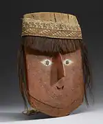 In type of fabric used include llama wool, cotton, chiffon, and feathers.[2] Their technique involved were decorated open weave, brocade, embroidery, and painting.[2] Brushes were used to paint anthropomorphic, zoomorphic, geometric and other creative designs directly on the canvases. The Chancay are known for the quality of their painted tapestries. The typically geometric designs also included drawings of plants, animals such as fish, cats, birds, monkeys and dogs (most notably the hairless Peruvian dog[4]) as well as human figures.[3] Some of the human fiber sculptures are elaborate and include such scenes as a mother teaching her daughter to weave on a backstrap loom.[5] Birds and deities wearing crescent-like headdresses were one of the more common decorative features.[1] They produced a variety of goods such as clothing, bags, and funeral masks.[2]