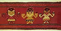 The most well-known Chancay artefacts are the textiles which ranged from embroidered pieces, different types of fabrics decorated with paint. A variety of techniques, colours and themes were used in the making of textiles.[2] They used an array of colours including yellows, browns, scarlet, white, blues and greens.[1]