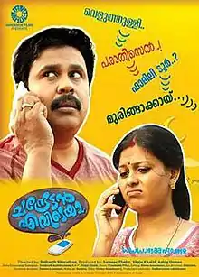 Chandrettan Evideya (English: Chandrettan, Where Are You)[6] is a 2015 Malayalam romantic fantasy comedy film directed by Sidharth Bharathan. The film was produced by Sameer Thahir, Shyju Khalid and Ashiq Usman.[7] It stars Dileep alongside Anusree, Namitha Pramod and K. P. A. C. Lalitha in the main roles. It is the second directorial of Sidharth. The story and screenplay is penned by noted author Santhosh Echikkanam who had teamed up with Sidharth in his directorial debut Nidra (2012). The songs are composed by Prashant Pillai. Cinematography is handled by Shyju Khalid and editing by Bavan Sreekumar. The costumes are designed by Mashar T Hamsa.