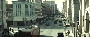 Forgoing the closure favored by its contemporaries, Changeling's final sequence reflects Collins' renewed hope that Walter is alive.[62][63] The shot is a two and a half minute sequence showing Collins' walking off to become lost in a crowd.[62] The sequence is representative of the range of effects that feature throughout the film; Los Angeles is presented as major character,[52] brought to life by unobtrusive peripheral imagery that allows the viewer to focus on the story and the emotional cues. The "hustle and bustle" of the sequence was required to convey that downtown Los Angeles in 1935 was a congested urban center. In the closing shot, the camera tilts up to reveal miles of city blocks,[62] pedestrians on the streets, cars going by and streetcars running along their tracks.[52] The version of the film that screened at Cannes did not include this sequence; the scene faded to black as Collins walked away. The new 4,000-frame shot was Owens' idea. He felt the abrupt cut to black pulled the viewer out of the film too quickly, and that it left no room for emotional reflection. Owens said, "There is a legend at the end before the credits. The legend speaks to what happened after the fact, and I think you need to just swallow that for a few moments with the visual still with you." Owens told Eastwood the film should end like Chinatown (1974), in which the camera lifts to take in the scene: "The camera booms up and she walks away from us from a very emotional, poignant scene at the end, walks away into this mass of people and traffic. It's very hopeful and sad at the same time."[62]