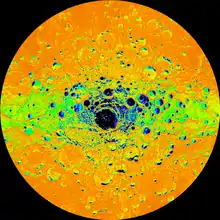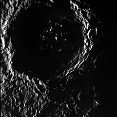 Chao Meng-Fu is a 167 km (104 mi) diameter crater on Mercury named after the Chinese painter and calligrapher Zhao Mengfu (1254–1322). Due to its location near Mercury's south pole (132.4° west, 87.3° south) and the planet's small axial tilt, an estimated 40%[1] of the crater lies in permanent shadow. This combined with bright radar echoes from the location of the crater leads scientists to suspect that it may shelter large quantities of ice protected against sublimation into the near-vacuum by the constant −171 °C (−276 °F) temperatures.