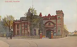 The building, which was designed by James Benest in the Gothic style to incorporate part of a tower from the old city wall and built by William Gilbert, was opened by the Prince and Princess of Wales in October 1866.[1] It was initially used by elements of the 1st Norfolk Rifle Volunteer Corps which became the 1st Volunteer Battalion, The Norfolk Regiment in 1883.[1] It became the headquarters of the 4th Territorial Battalion the Norfolk Regiment when that battalion moved from the Bethel Street drill hall during the First World War.[2] The battalion was mobilised at the Chapel Field Road drill hall in September 1939 for service in the Middle East and then the Far East during the Second World War.[3] Following the amalgamations that lead to the formation of the 1st East Anglian Regiment in 1959, the Chapel Field Road drill hall was decommissioned and then demolished to make way for the ring road in 1963.[1]