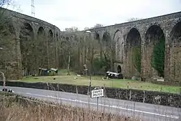 The masonry of the viaduct is composed of rubble work in regular courses, and the span of each arch is 42 feet (13 m). The gradient of the line over the viaduct is 1 in 90 throughout; at its highest point it is 102 feet (31 m) from water to rail level.[4]