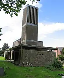 The new chapel is square and consists of a raised altar, nave, lobby, two aisles and a separate tower, containing two bells. Some remains of the earlier Norman church can be seen in the walls. The font survives from this earlier building.[6]